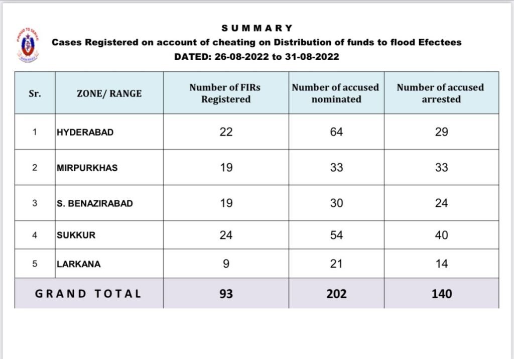 آئی جی سندھ کے واضح احکامات پر عمل درآمد کرتے ہوئے پولیس نے سیلاب سے متاثرہ علاقوں میں بینظیرانکم سپورٹ پروگرام کے تحت امدادی رقوم حاصل کرنیوالی خواتین سے رقوم ہتھیانے اور کمیشن وصولی میں ملوث 202 نامزد ملزمان میں سے 140 ملزمان کو پولیس نے گرفتار کرکے باقاعدہ 93 کیسز درج کرلیئے ہیں۔